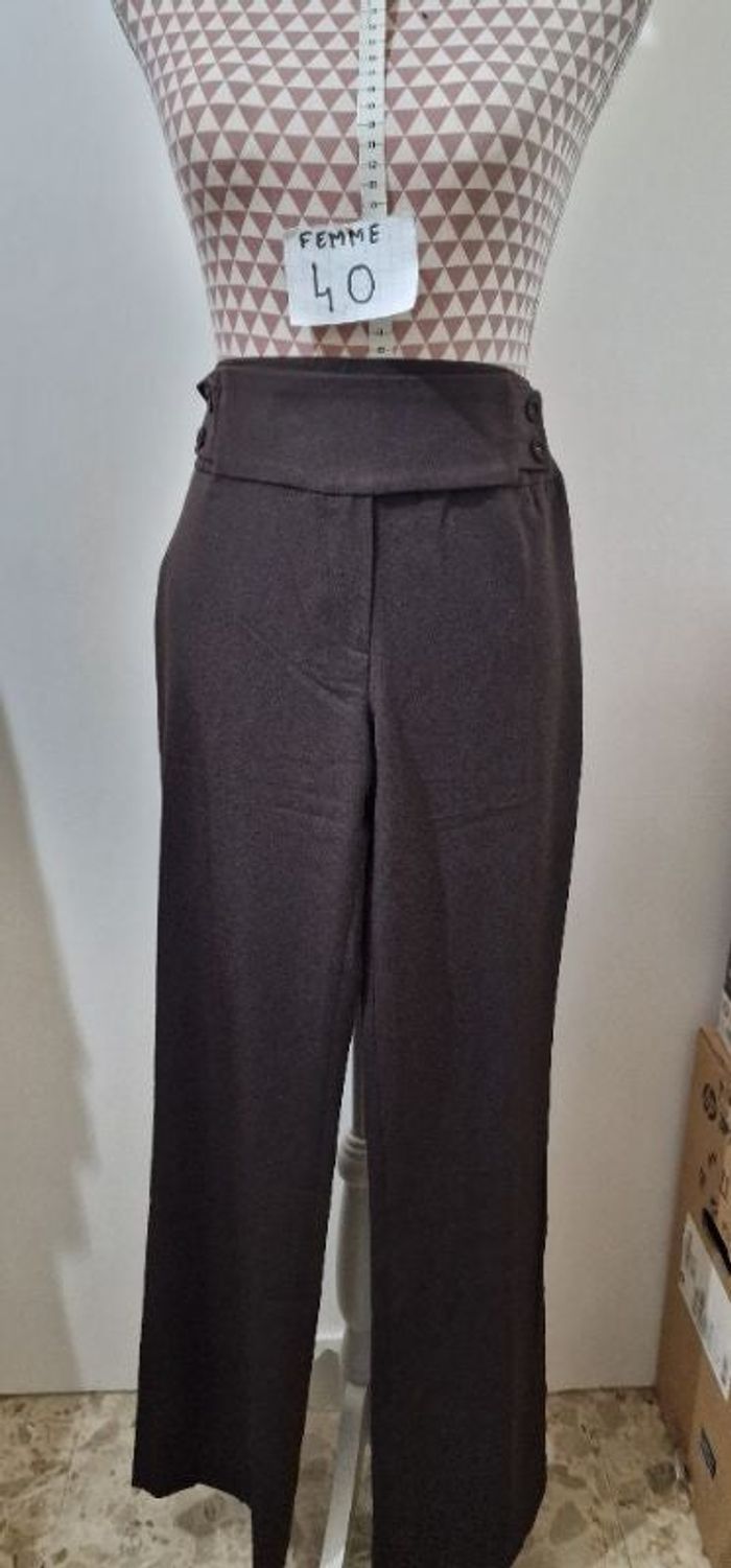 Pantalon, marron, en très très bon état, en polyester &viscose &elasthanne,longueur 108cm,largeur 42cm,taille standard, forme Wide, marque Nafnaf =8€