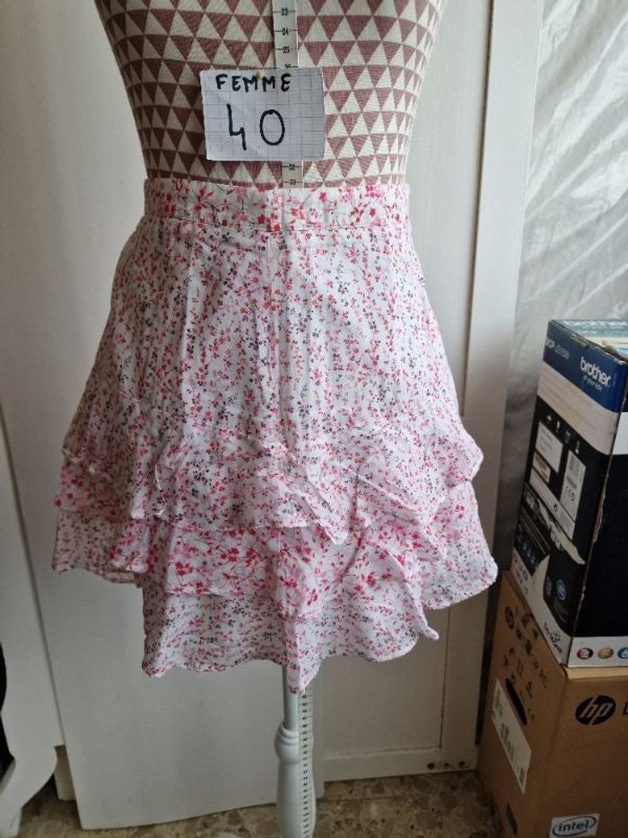 Jupe,mini,à fleurs dominance rose, en très très bon état, en coton, longueur 40cm, marque MiM =4€