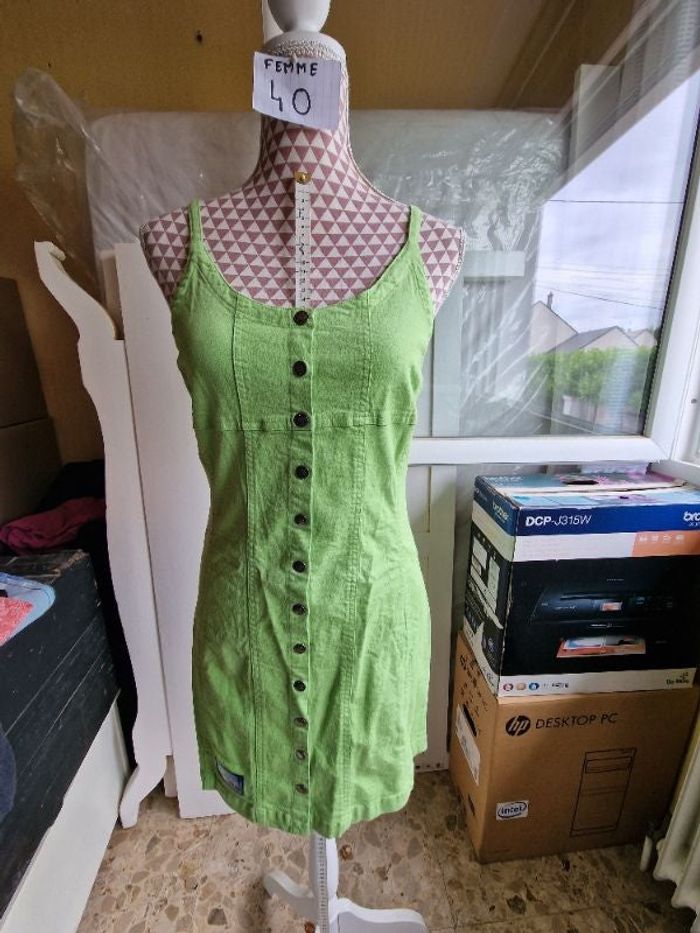 Robe, mini,en jeans, verte, en très très bon état,en coton & lycra, longueur 82cm, marque Naf Naf =10€