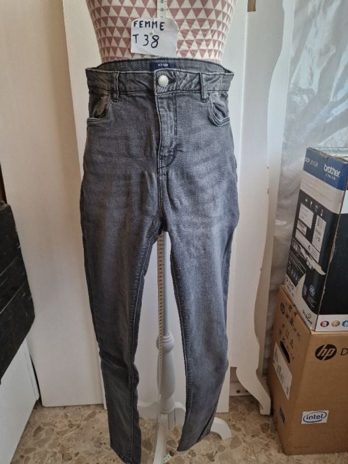 Jeans, gris, taille haute, forme skinny, en très très bon état, longueur 97cm, en coton & elasthanne, marque Kiabi =5€