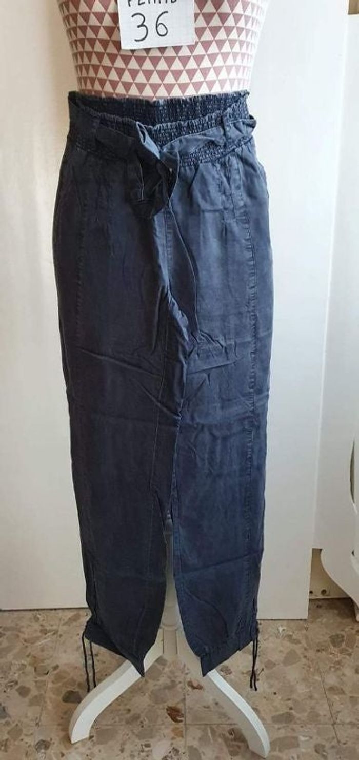 Pantalon fluide, bleu marine, en Lyocell, en très très bon état, taille standard, forme droit, taille élastique et ceinture, en bas serrage par cordon, longueur 98cm ,marque Camaïeu =6€