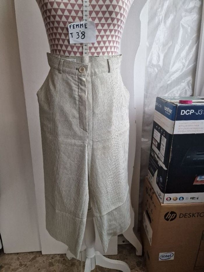 Pantalon fluide, en polyester, en très très bon état, 2 poches latérales, taille haute, blanc à fines rayures vertes, longueur 75cm, marque C&A =6€
