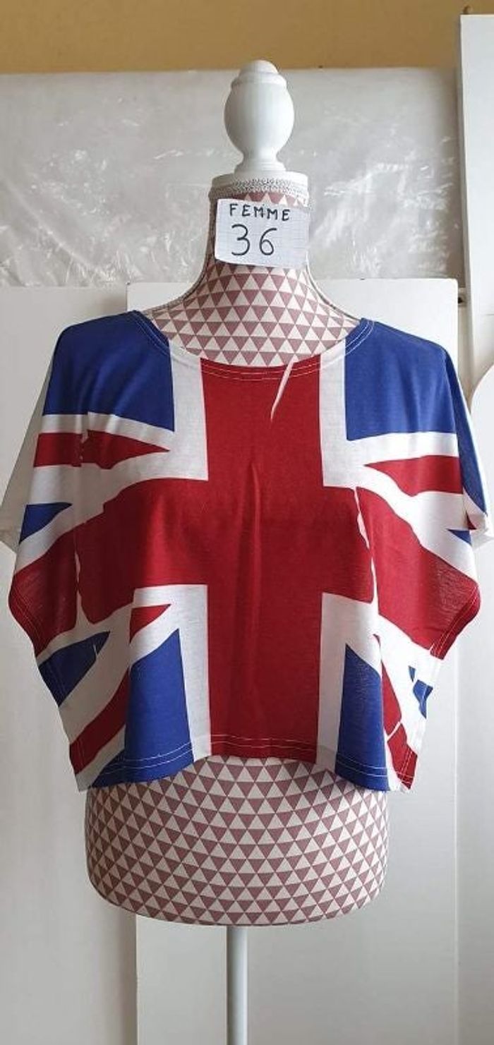 Crop top ,blanc à motif anglais, en très très bon état, marque MIM, polyester =4€