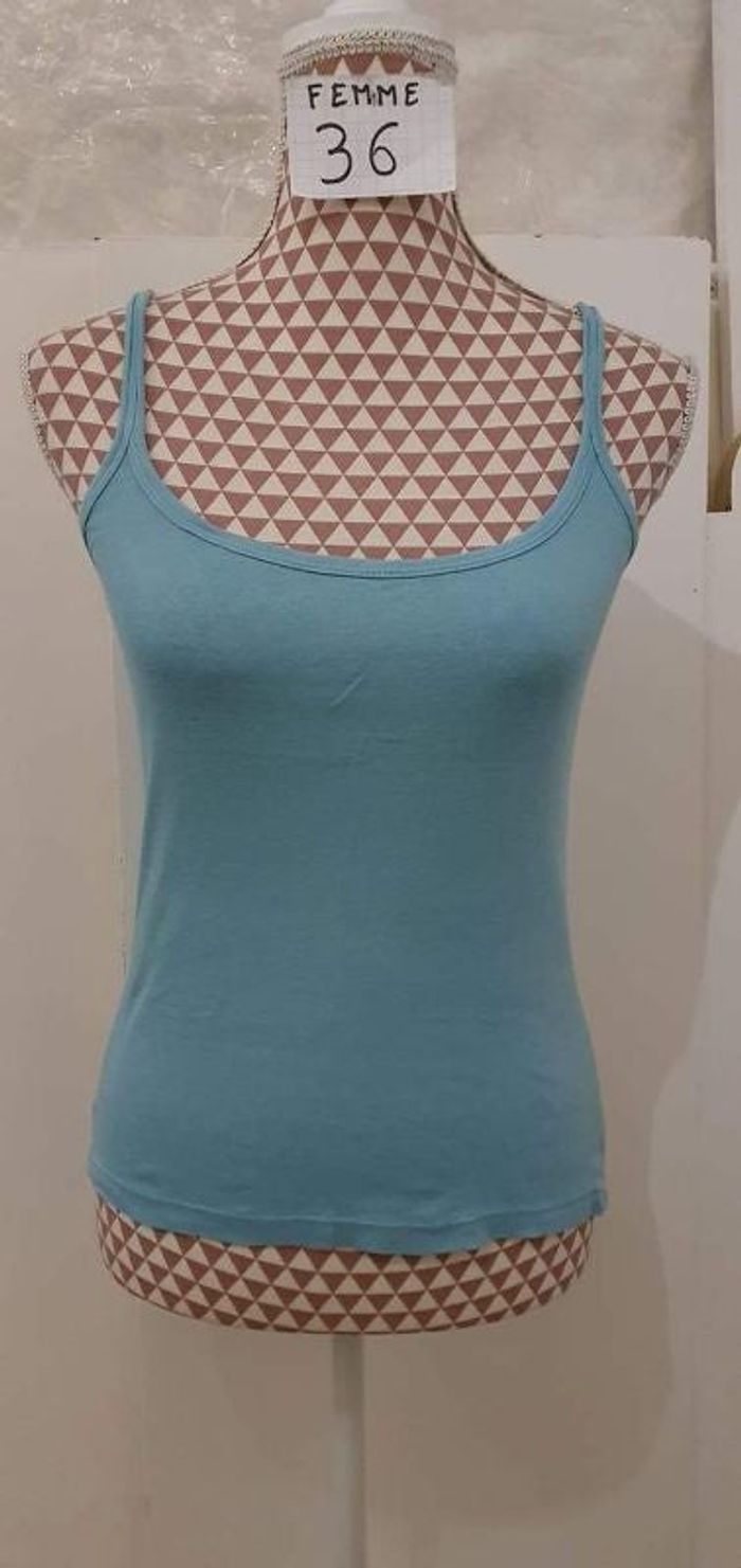 Débardeur, bleu,coton,en très très bon état,longueur 46cm,marque Camaïeu =4€