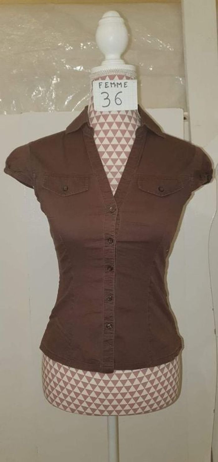 Chemise, marron, coton, en très très bon état,longueur 48cm, marque Pimkie =4€