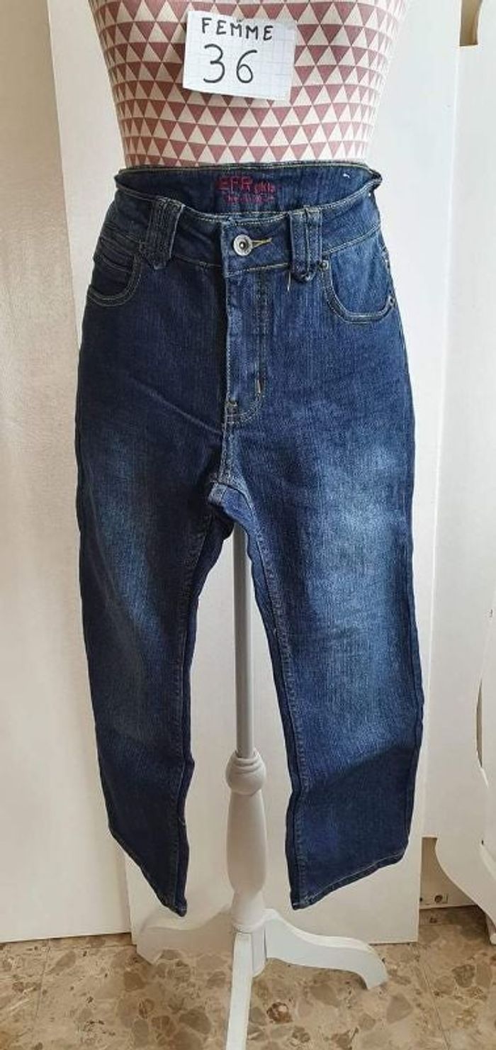 Jeans, bleu foncé légèrement décolorés aux cuisses, poche arrière déco oiseaux, coton polyester et elasthanne, en très très bon état, marque Efratis, taille standard, forme régular, longueur 83cm=7€