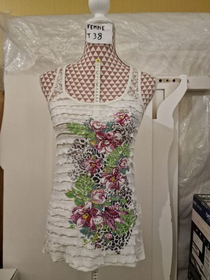 Débardeur, blanc à motif coloré et strass, dentelle épaules et dos, en très très bon état, en polyes