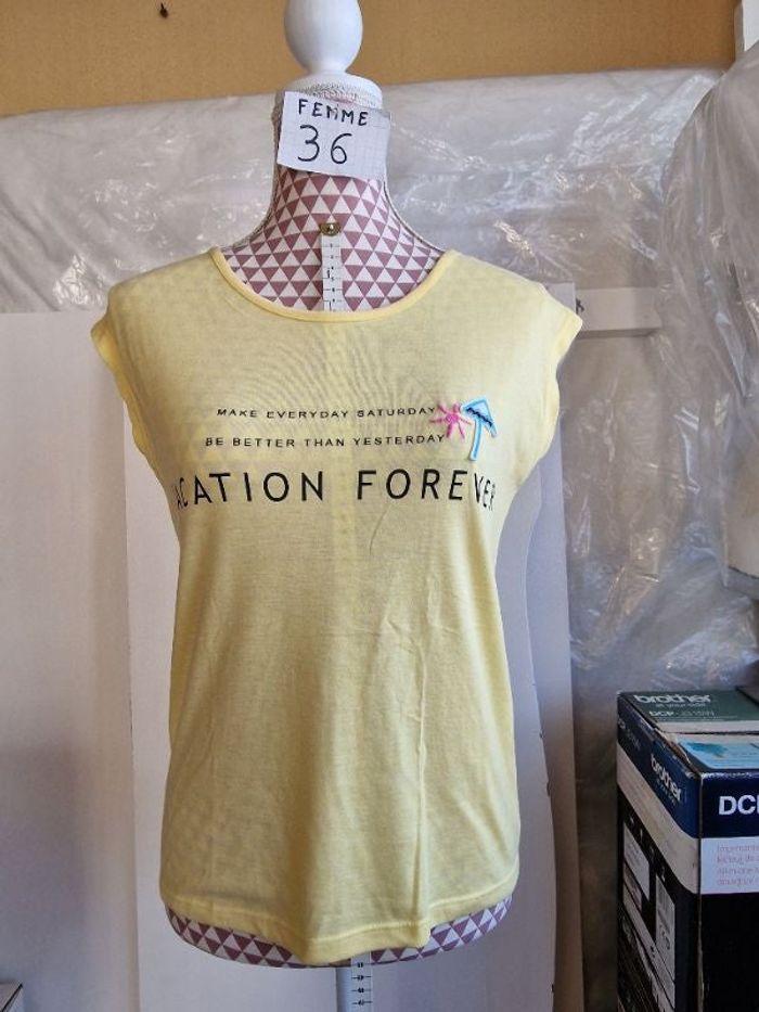 Tee-shirt, jaune à inscription noir, neuf, en polyester&viscose, longueur 56cm, marque Kiabi =4€