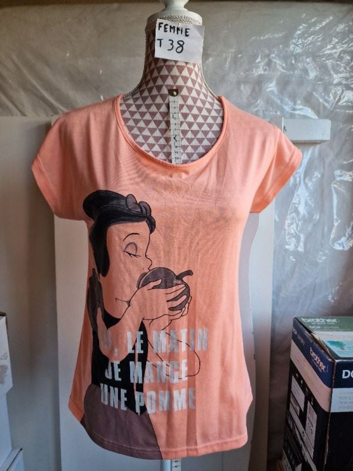 Tee-shirt, saumon, avec motif noir et gris, longueur 60cm, en très très bon état, en polyester, marque Disney =5€