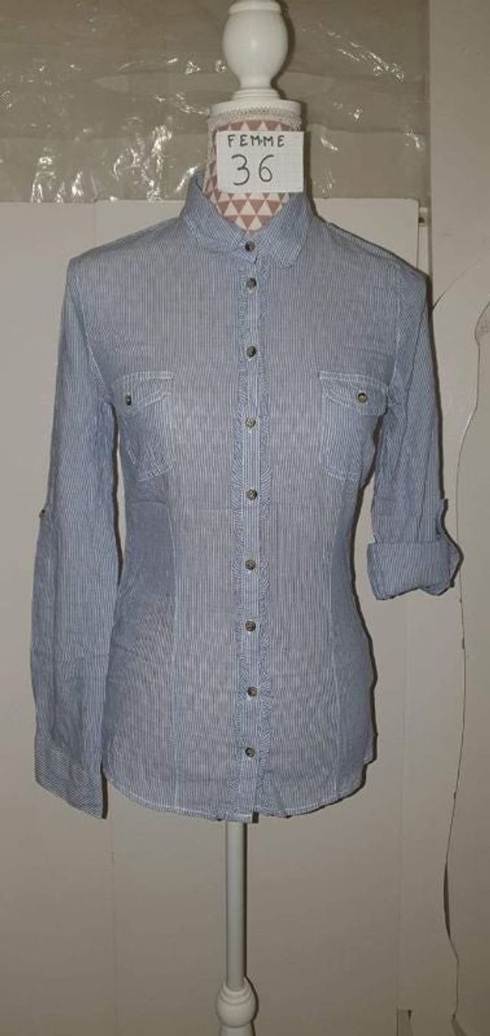 Chemise, bleu a fines rayures blanches, en coton, manche longue qui se retrousse pour les transformé en courtes, en très très bon état,longueur 55cm, marque Pimkie =5€