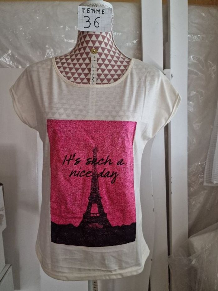 Tee-shirt, beige, avec impression rose pailleté ,neuf juste été laver,en polyester, longueur 61cm, marque Women only =5€