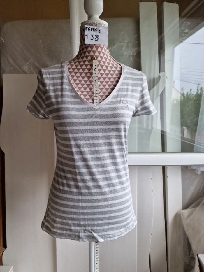 Tee-shirt, blanc à rayures grises,en très très bon état, en coton &elasthanne, longueur 62cm, marque Puma =8€