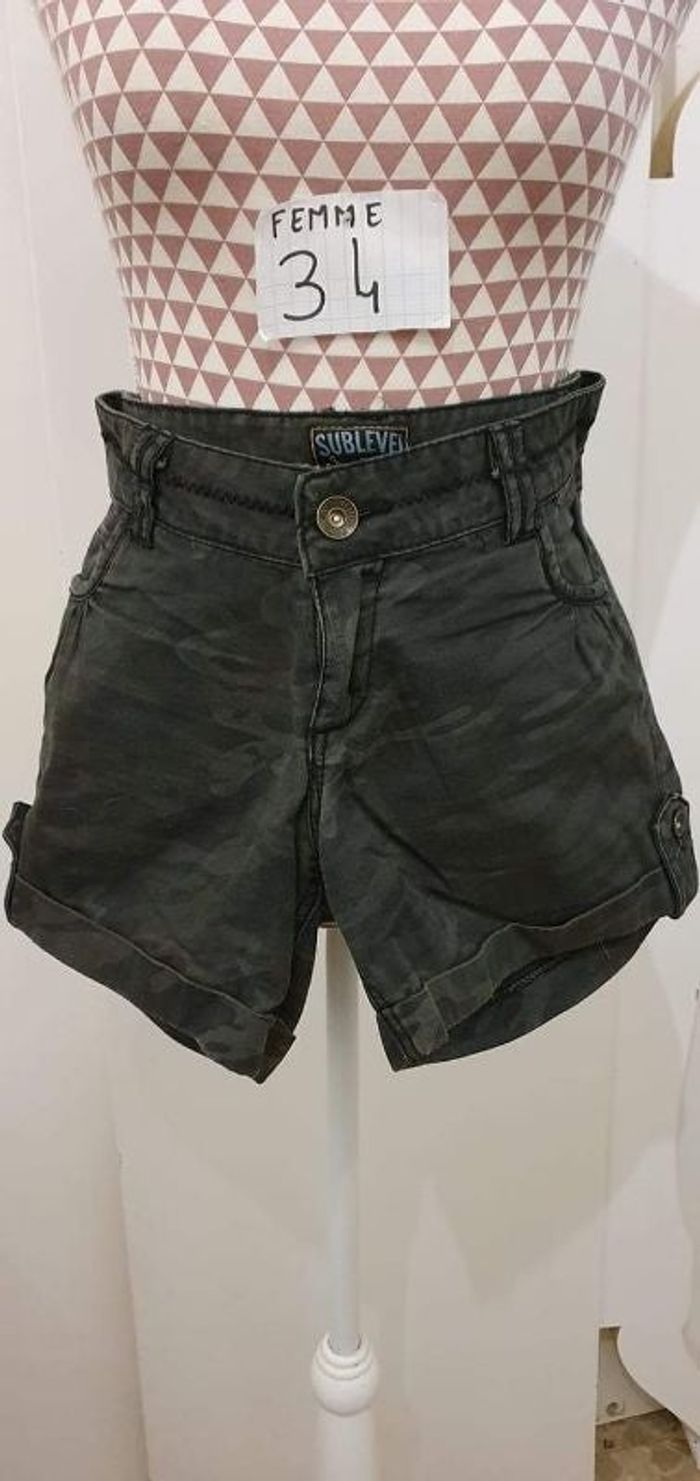 Short, coton,vert armée, en très très bon état,taille standard, longueur 31cm,marque Sublevel =5€