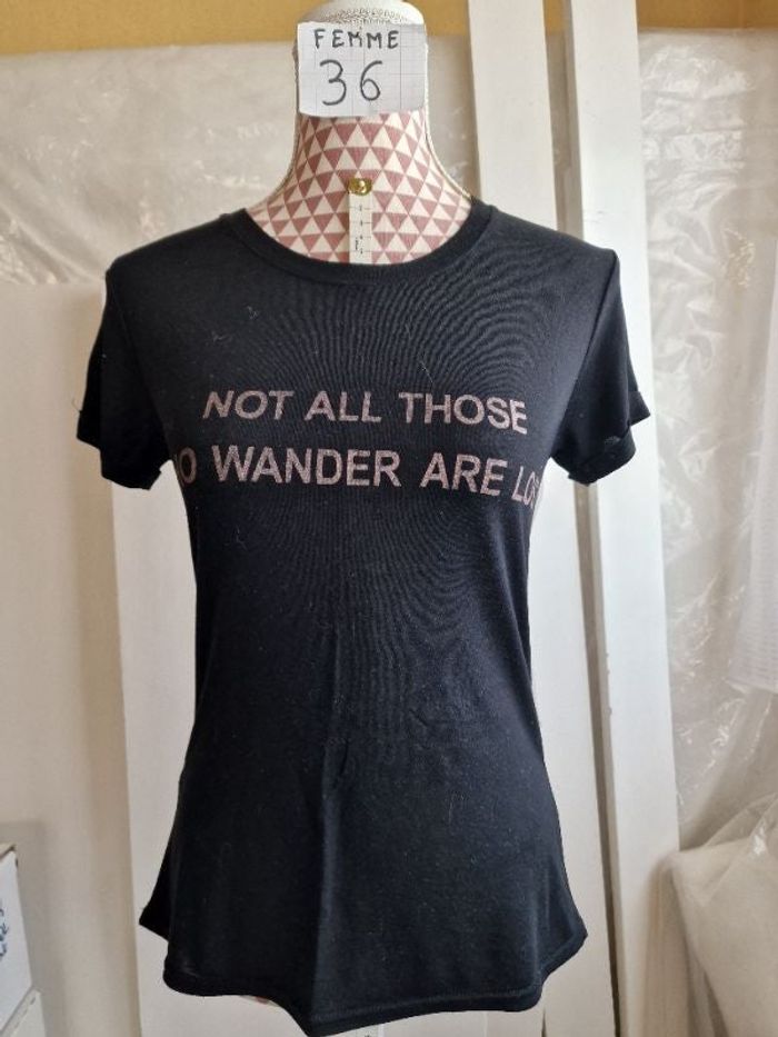 Tee-shirt, noir à inscription cuivre, en viscose polyester elasthanne, longueur 59cm, en très très bon état, marque Women only =4€