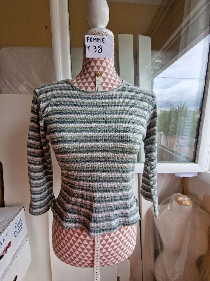 Tee-shirt, vert à rayures, crop top,longueur 44cm, manches 3/4, en très très bon état,en coton &acrylique, marque Pimkie =4€