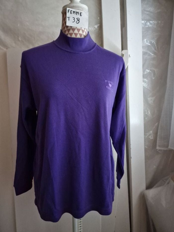 Tee-shirt, col montant, violet, en polyester &coton, en très très bon état, longueur 63cm, marque Boys loveGirls =4€