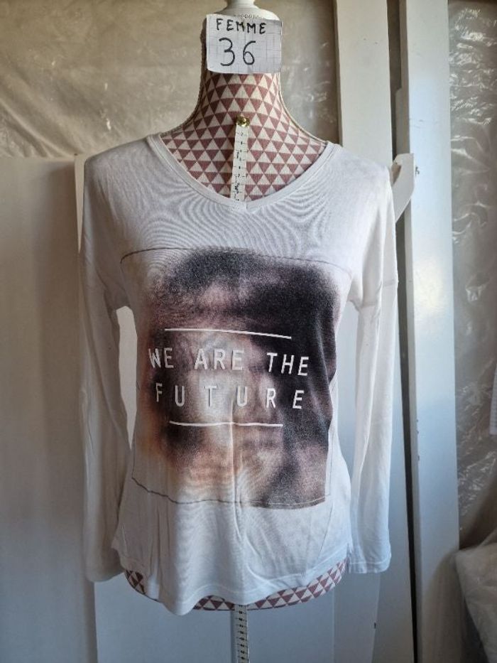 Tee-shirt, blanc cassé avec motif et inscription, en très bon état, en modal& polyester, longueur 57cm dos 63cm,marque Kiabi =4€