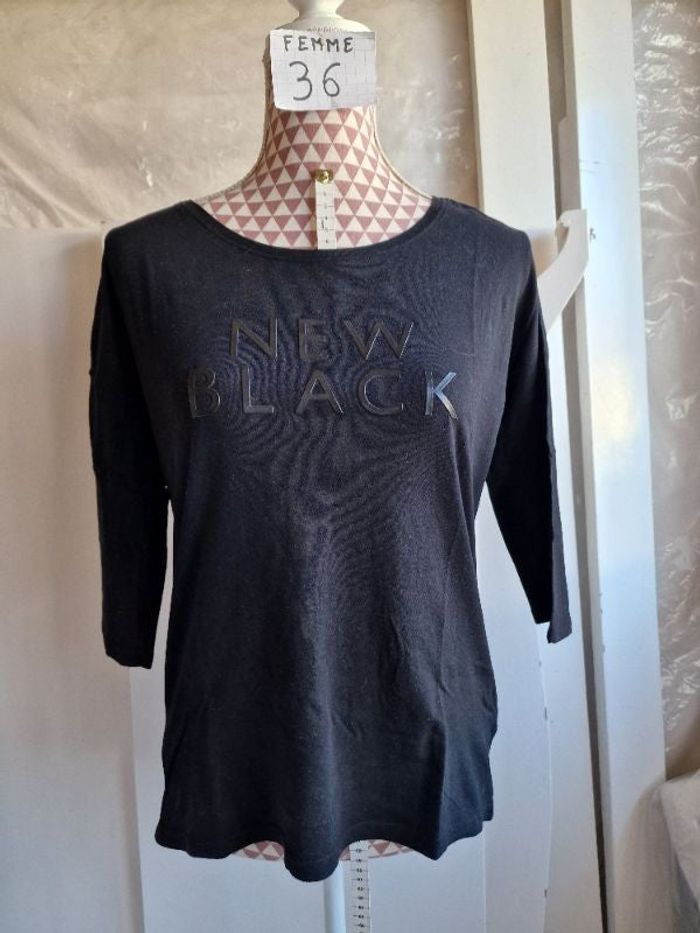 Tee-shirt, noir à inscription noir simili cuir, manches 3/4,longueur 59cm,en très très bon état, mar