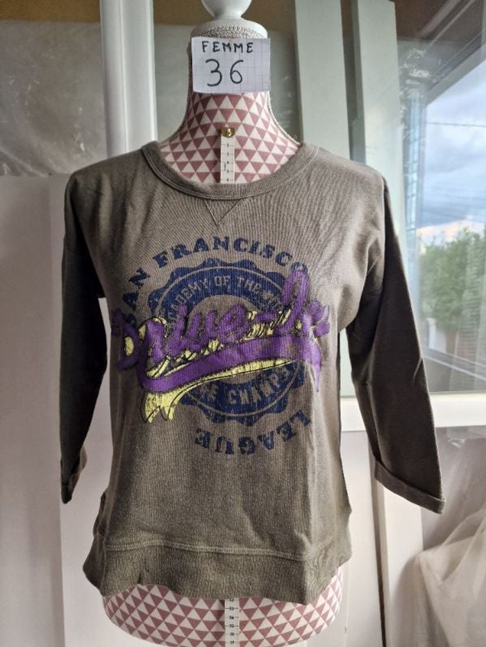 Sweat-shirt, vert forêt, avec inscription,manche 3/4,longueur 51cm,en très très bon état,en coton& polyester, marque Kiabi =4€