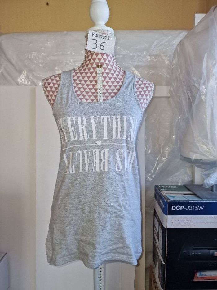 Débardeur, gris à inscription blanche, longueur 61cm devant 66cm derrière, en coton &viscose, en très très bon état, marque Esmara =4€