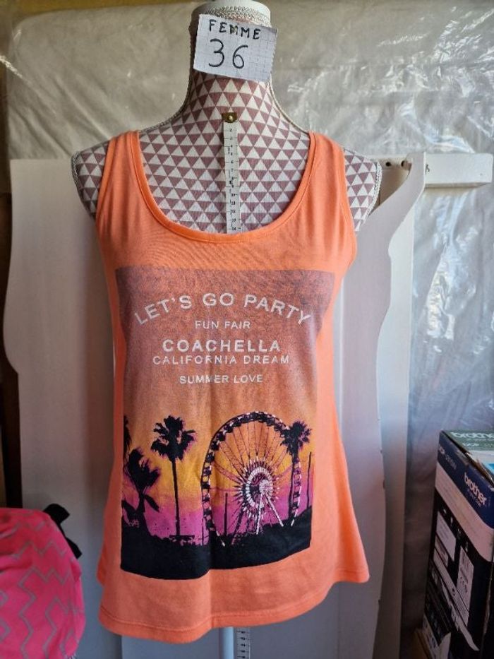 Débardeur, saumon, à motif noir rose blanc, en très bon état, longueur 60cm,en polyester, marque Women only =4€