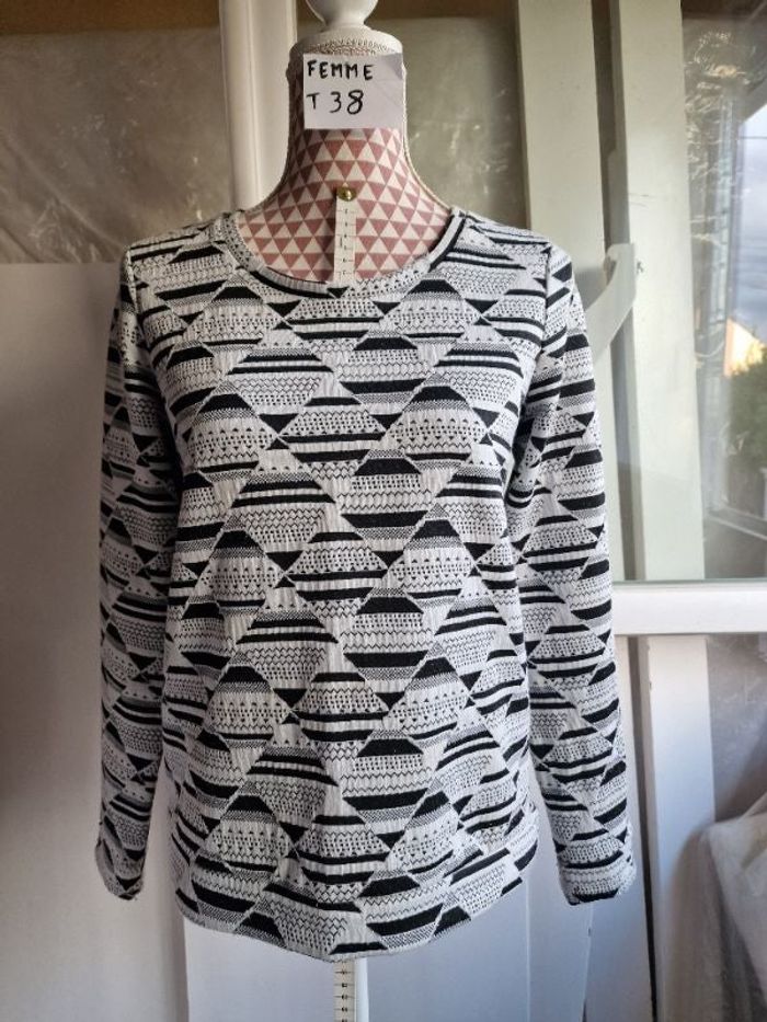 Sweat-shirt, noir &blanc, en bon état( légèrement bouloché),en polyester &elasthanne, longueur 57cm, marque Esmara =4€