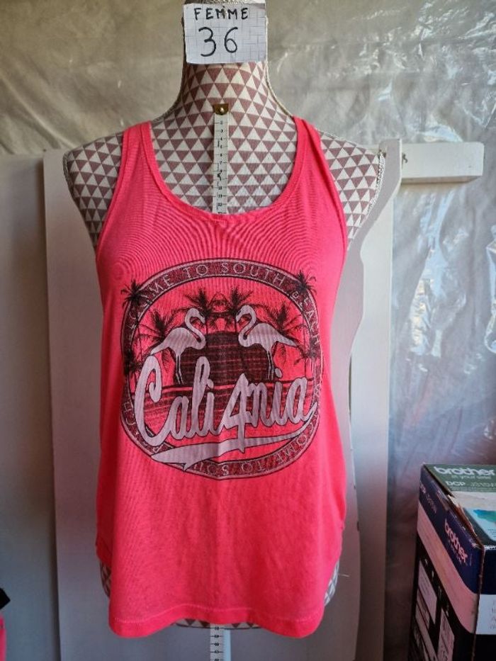 Débardeur, rose fluo, à motif argenté, en très très bon état, longueur 58cm, marque Gemo =4€