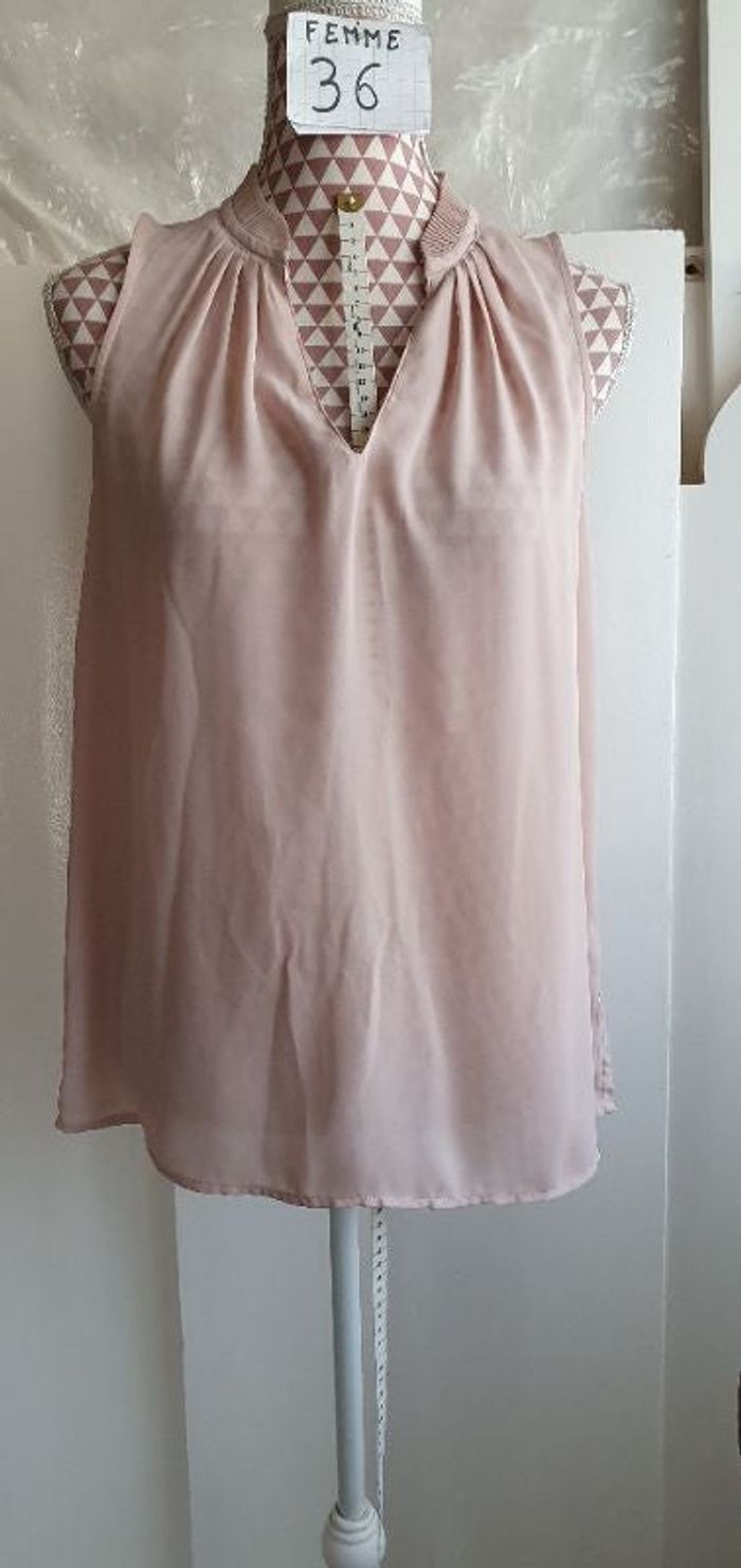 Débardeur, rose poudré, en très très bon état, légèrement transparent, en polyester, longueur 62cm,marque Kiabi =4€