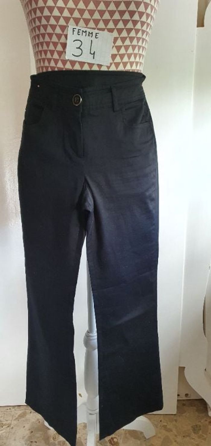 Pantalon, noir, en très très bon état, taille haute, forme flare, longueur 92cm, en coton &elasthanne, marque Camaïeu =4€