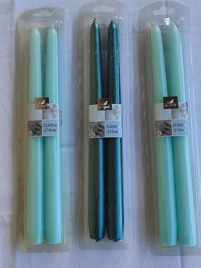 Vends 6 bougies hautes 30 cm 4 vert pâle 2 vert irisé Neuf