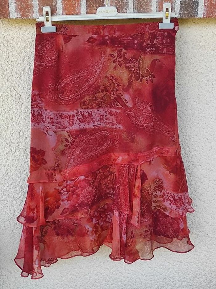 Vends jupe longue fluide rouille à motifs Taille 42 Un jour ailleurs 100 % soie Fermeture éclair et bouton sur le côté Volants sur le bas Très bon état, très peu portée