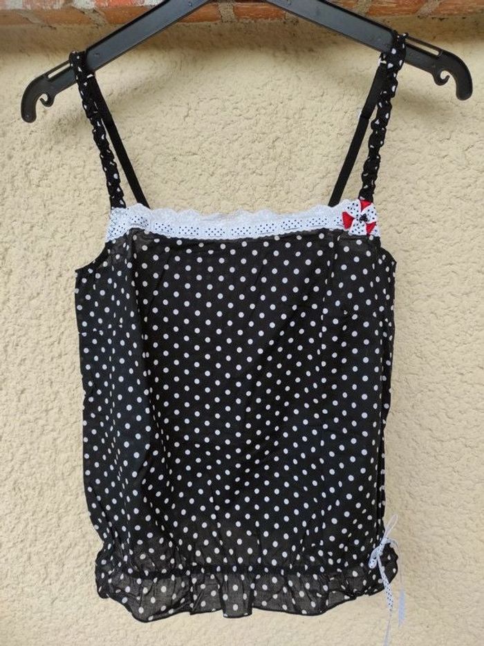 Vends caraco Billet-Doux noir à pois blancs Noeud sur le côté gauche bas Broderie blanche sur le liseré du haut Fronces sur le bas Bretelles réglables Taille 38/40 100% coton Peut se porter en dessous ou en petit haut d'été sur un soutien gorge