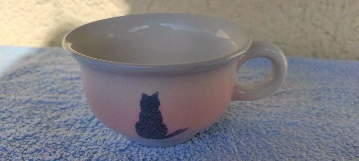 Vends déjeuner en faïence rose et mauve avec un chat en décor Faïencerie de Pornic Diamètre intérieur d'environ 11 cm Très bon état