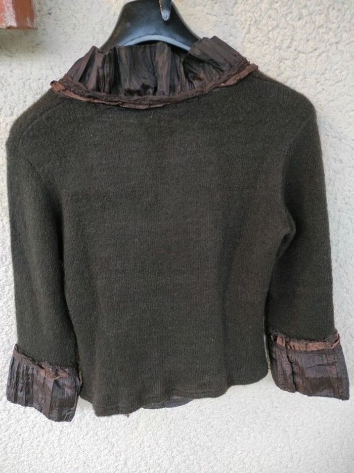 Vends pull fantaisie Espérance marron avec imitation taffetas et dentelle 100% polyester Taille unique mais idéal pour un 38/40