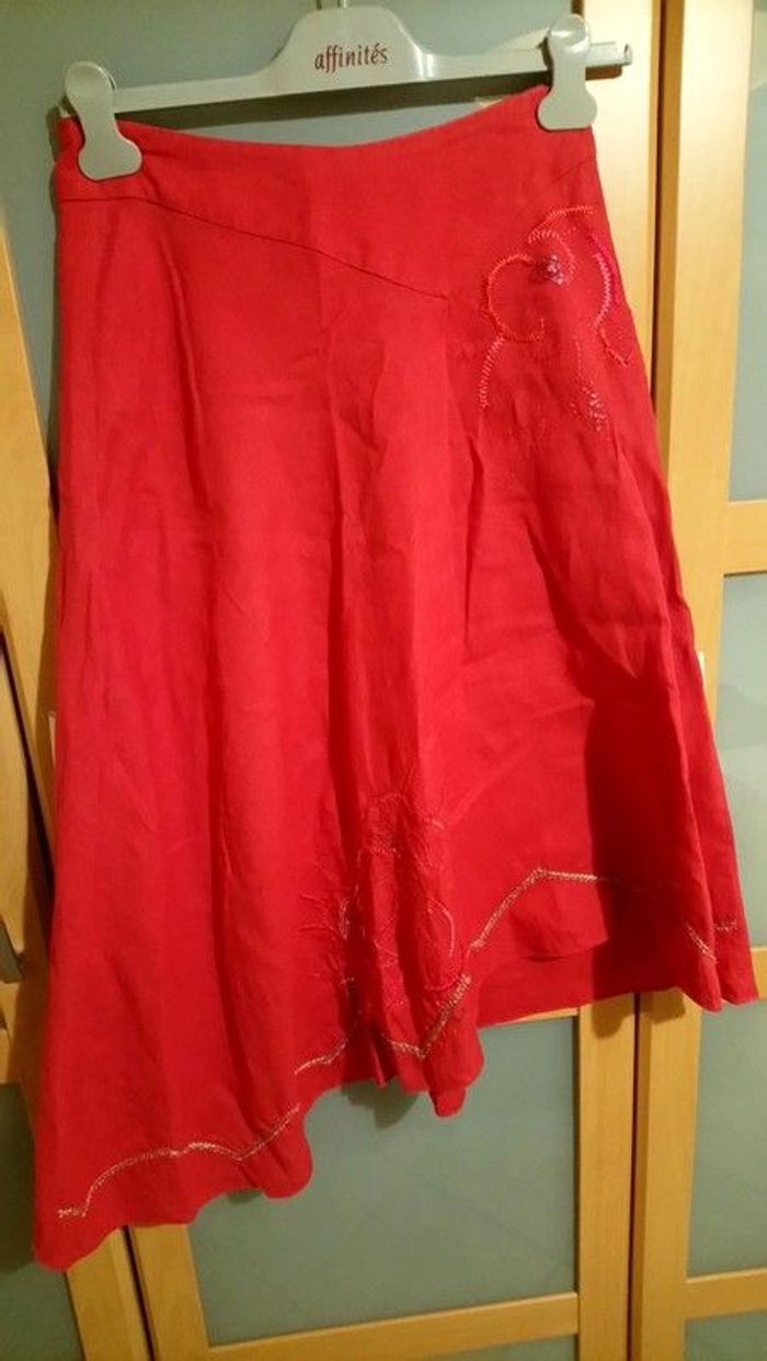 Jupe asymétrique en 100% lin de couleur rouge rosée et brodée Taille 36 très bon état
