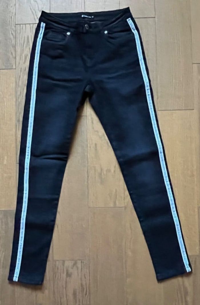 Jean slim-skinny couleur noir, bande blanche noire + argentée sur le côté. Taille normale. Composition : coton 98% - élasthane 2% Excellent état - Neuf, article jamais porté Marque "Follow me" (acheté chez GEMO).