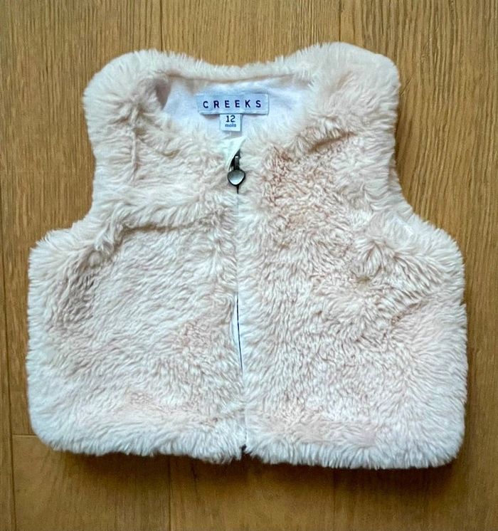 Jolie petite veste en fourrure, sans manches, de couleur rose poudré. Fermeture éclair avec petit cœur. Doublure 100% coton blanc.