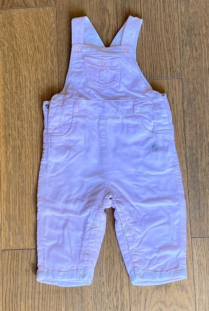 Jolie salopette en velours ras. Rose pâle, entièrement doublée en coton rayé rose et blanc. Entrejambe pressionnée.