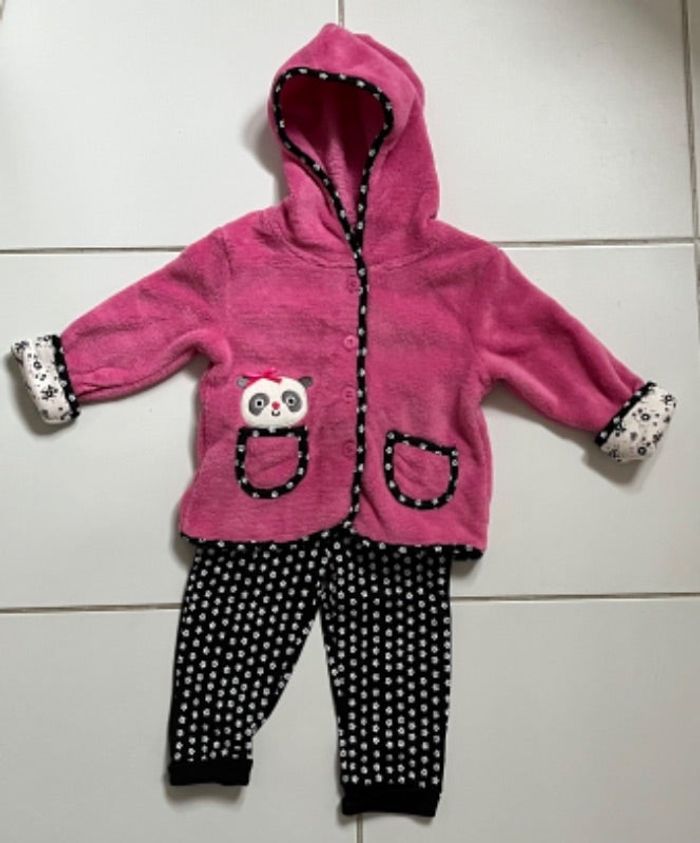 Joli ensemble veste rose « peluche » rose toute douce + legging assorti noir à petites fleurs blanches.
