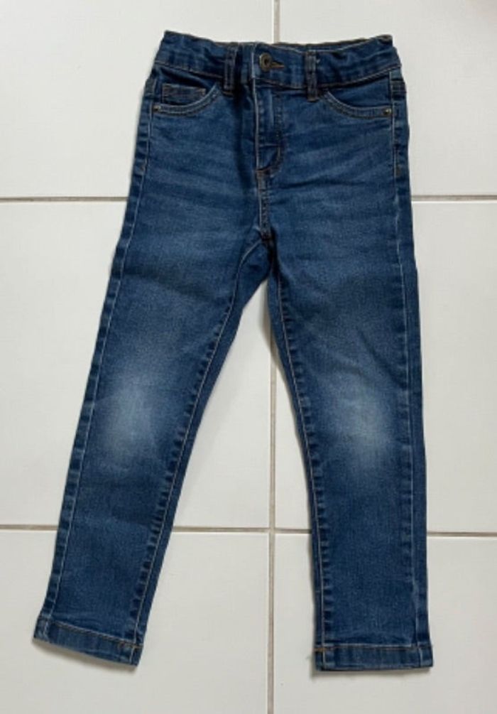 Jean slim, taille 4/5 ans. Système de resserrage à l’intérieur (élastiques). Usure normale aux genoux (taches minimes, photo 4).
