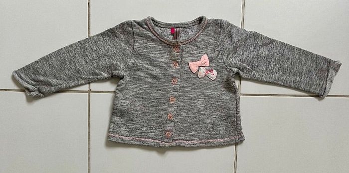 Jolie petit sweat en molleton, col rond, boutonné tout le long, gris chiné.