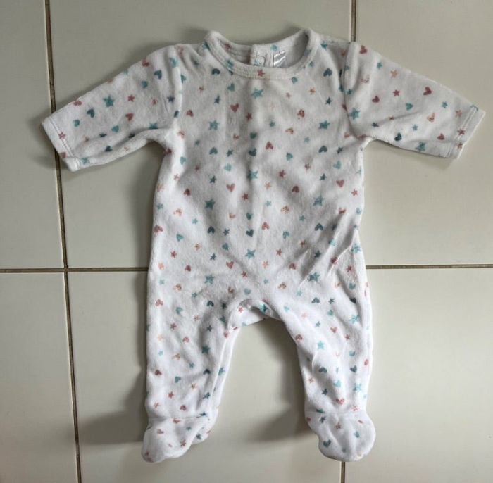Pyjama en velours blanc, avec petites étoiles et petits cœurs. Un peu jauni à l’encolure.