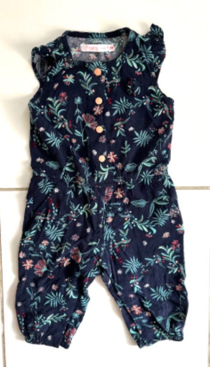 Jolie combinaison pantalon, sans manches, fond bleu marine, à fleurs. 4 boutons pression sur l’avant. Ouverture par boutons pression à l’entrejambe.