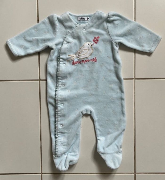 Joli Pyjama en velours bleu turquoise clair. Empiècement oiseau 🐦. Ouverture sur le côté avec petit galon volanté. 5 € le lot de 2 pyjamas au choix.