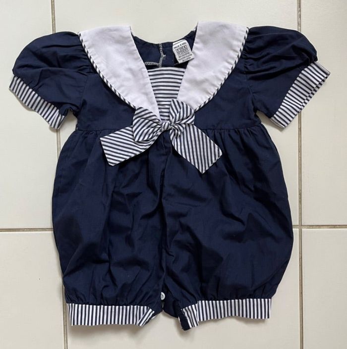 Jolie Barboteuse bleu marine, thème marinière. 65% Polyester - 35% Coton. Col blanc, noeud à rayures bleu marine et blanc. Manches ballon. Fermeture à l’entrejambe par 3 boutons.