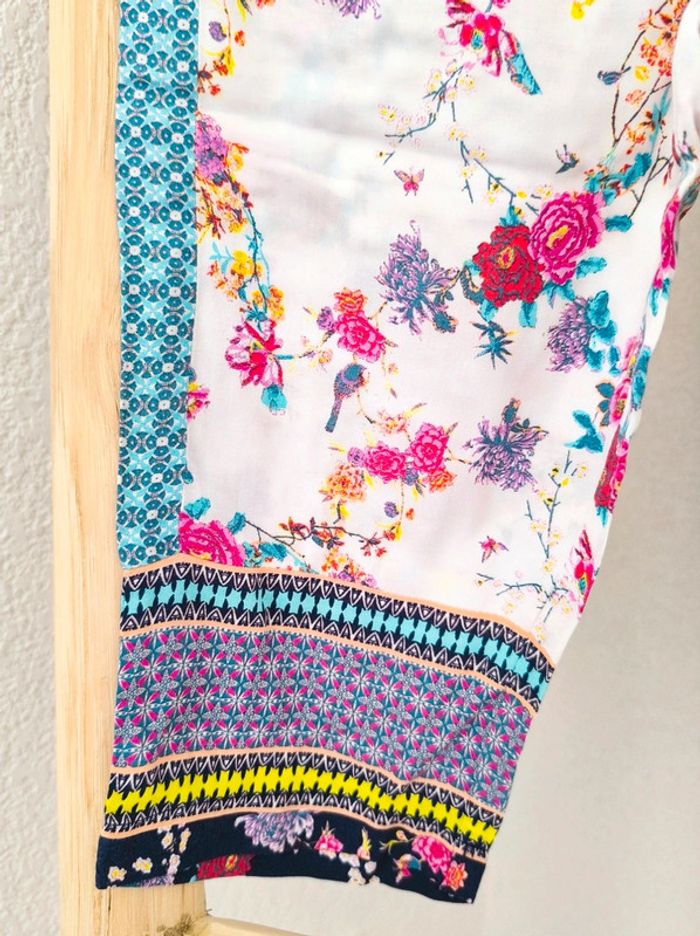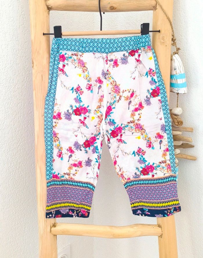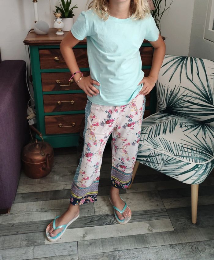 #loulaliefille4ans dans la recherche pour voir mon 4 ans fille Pantalon fin large 3 / 4 ans. Long en 3 ans et 3/4 en 4 ans . Texture fluide et douce , très agréable. Motifs fleuris et baroques. Photo 4 porté en 3 ans et photo 4 c'est un 9/10 ans porté en 10 ans ça donne une idée du rendu en pantacourt. Polyester Kiabi seconde main possible. #oiseaux #fleurs #blanc #jaune #turquoie # fushia #rouge