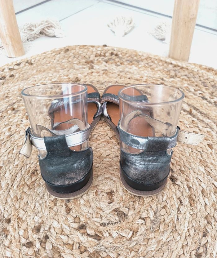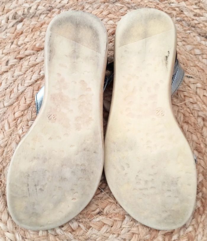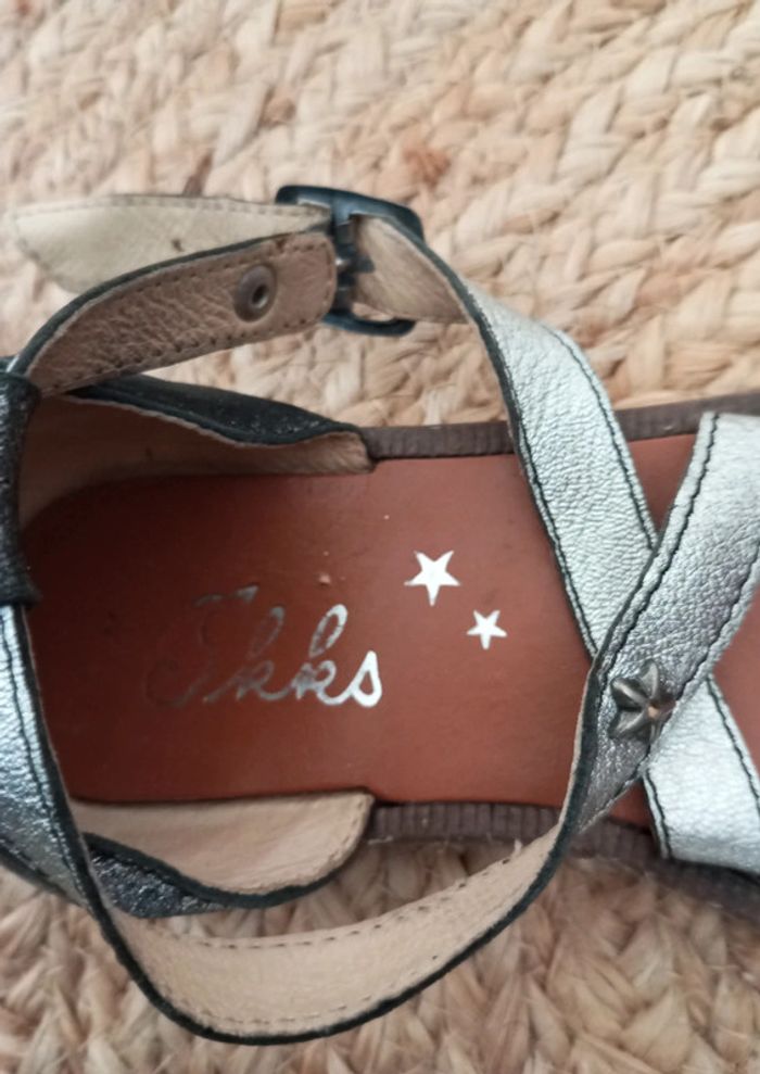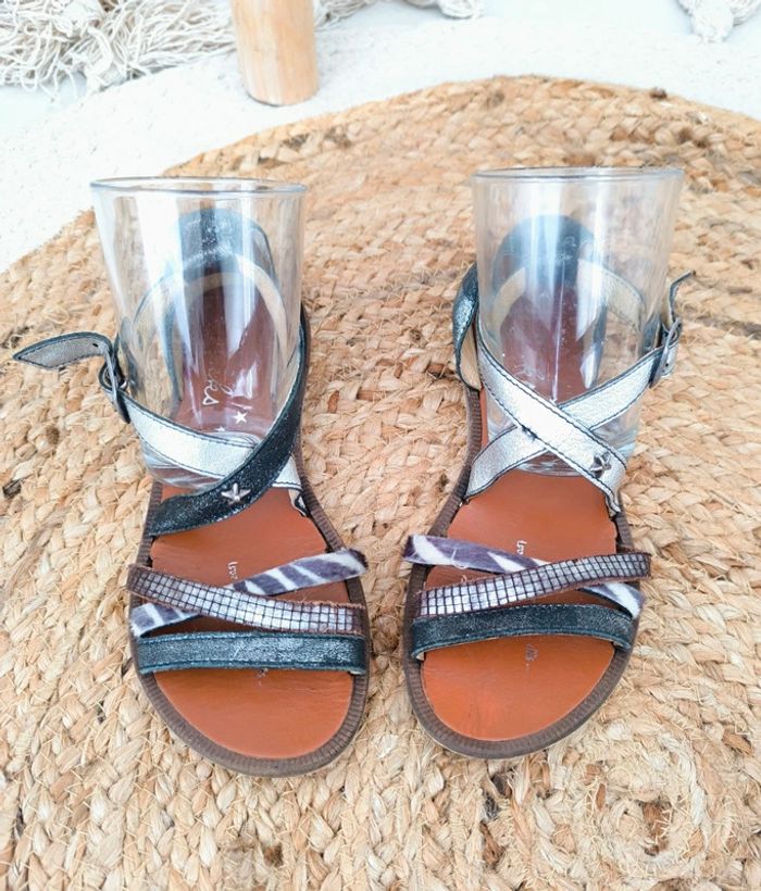 #loulaliechaus32 dans la recherche pour voir mes chaussures en t.32 sandales IKKS T.32 , lanières cuir argentées irisées et fausse fourrure zébré , semelle intérieure cuir.