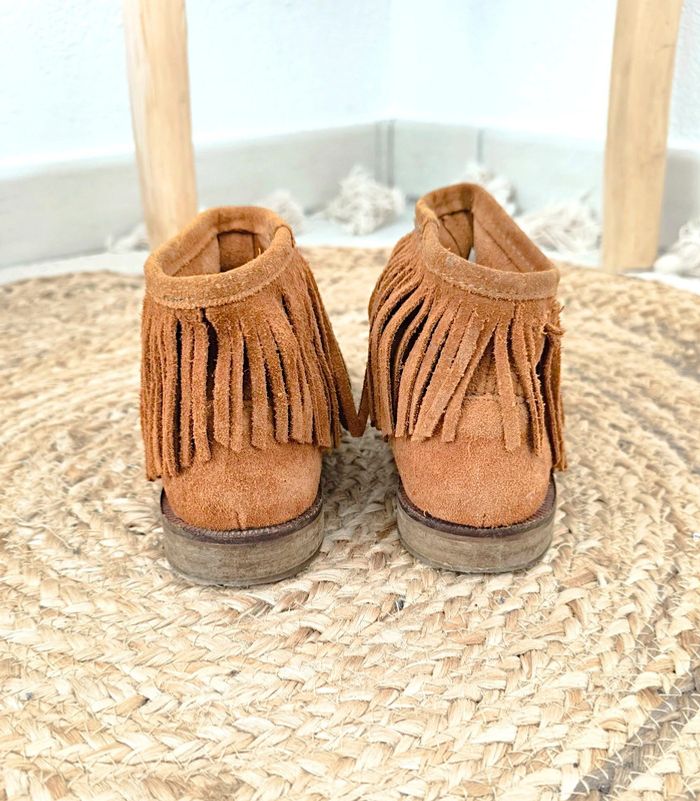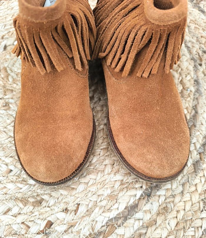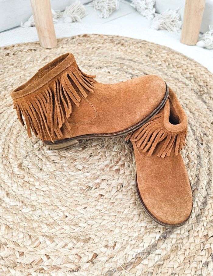 #loulaliechaus31 dans la recherche pour voir mes chaussures en t.31 Bottines à franges en daim Zara couleur Camel très peu portées, très bon état hormis qu'il manque 2 franges, s'enfilent facilement.
