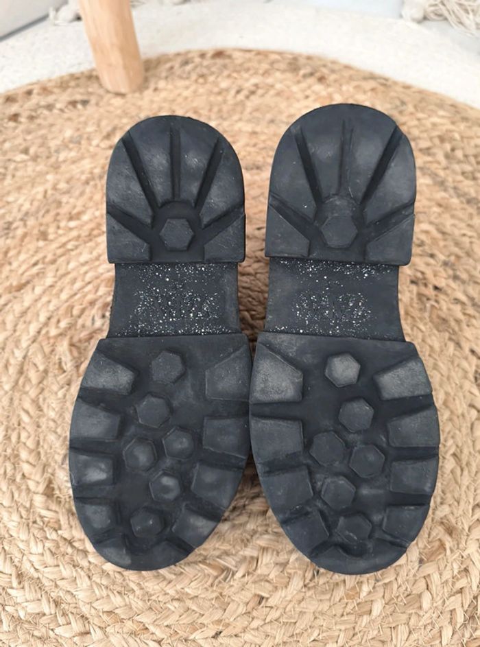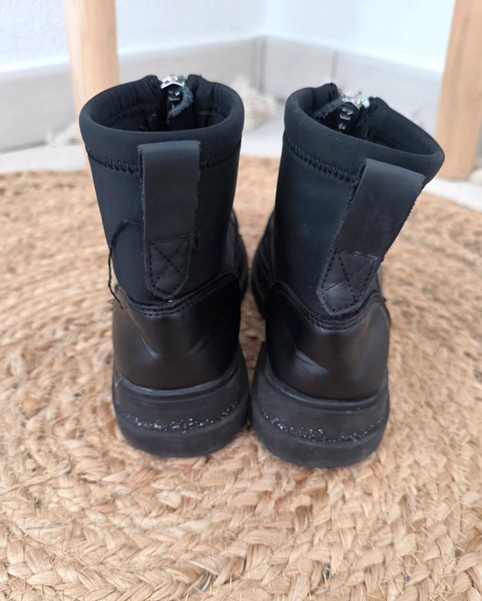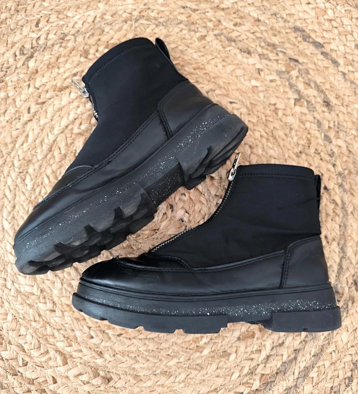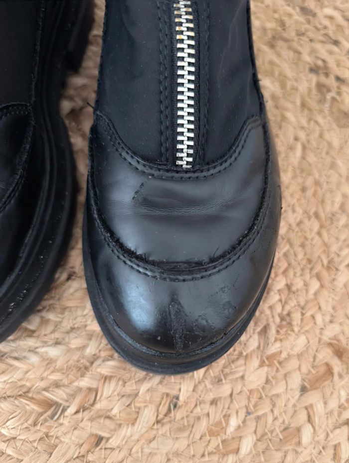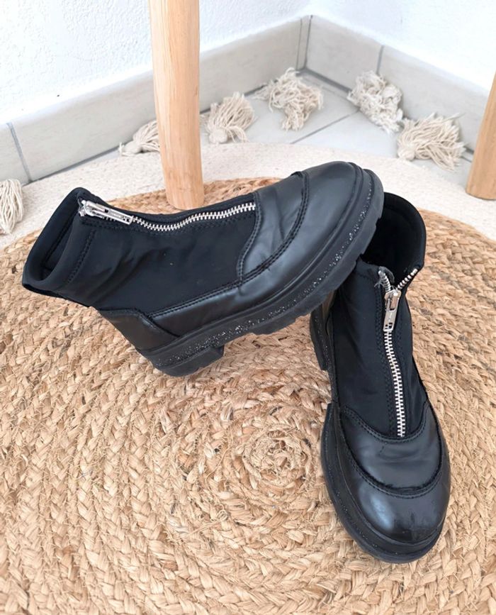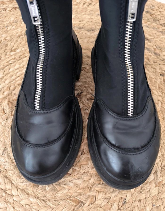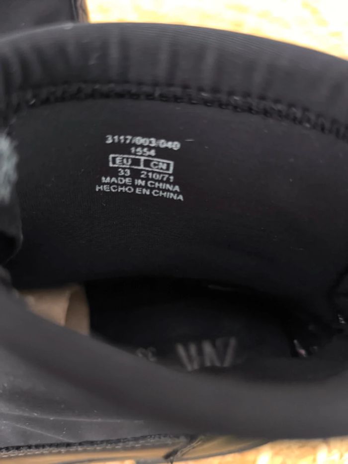 #loulaliechaus33 dans la recherche pour voir les autres chaussures 33 Boots baskets chaussettes ZARA noir , simili et tissu , fermeture eclair. Râpées sur l'avant d'une chaussure mais portés c'est discret. Se voit bien moins que sur la photo de près