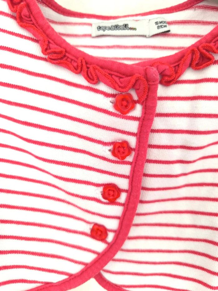 #loulaliefille18mois dans la recherche pour mon dressing 18 mois fille Gilet en coton court TAO , boutons fleurs , col en froufrous, rayé blanc, rouge Kiabi seconde main possible